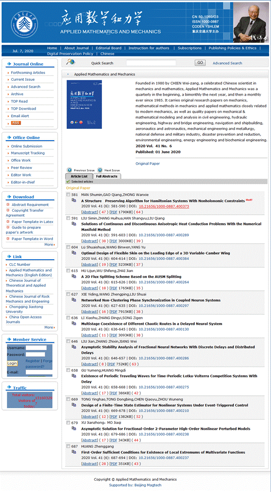 1.General information of the Journal English Title: Applied Mathematics and Mechanics Chinese Pinyin: Yingyong Shuxue He Lixue Sponsored by: Chongqing Jiaotong University Published by: the Editorial Office of Applied Mathematics and Mechanics ISSN: 1000-0887 CN: 50-1060/O3 International Code: M295 Domestic Code: 78-21 Founder: CHIEN Wei-zang Editor-in-Chief: ZHONG Wan-xie Vice Editors-in-Chief: ZHENG Xiao-jing, LAI Yuan-ming, LU Tian-jian, PENG Xiang-he,LIN Jia-hao, DENG Zi-chen, LIU Zhan-fang & YI Zhi-jian CODEN: YSHLEM Address: P.O. Box 90, Chongqing Jiaotong University, No.66 Xuefu Road,Nan’an District, Chongqing, 400074, P.R.China Email: applmathmech@cqjtu.edu.cn; amm1980@163.com Tel: 86 23 62652450; 86 23 62652611 Website:http://www.applmathmech.cn 2.Introduction to the Journal Founded in 1980 by CHIEN Wei-zang, a celebrated Chinese scientist in mechanics and mathematics, the Journal was a quarterly in the beginning, a bimonthly the next year, and then a monthly ever since 1985. It carries original research papers on mechanics, mathematical methods in mechanics and applied mathematics closely related to modern mechanics, as well as quality papers on mechanical & mathematical modeling and analysis in civil engineering, hydraulic engineering, highway and bridge engineering, navigation and shipbuilding, aeronautics and astronautics, mechanical engineering and metallurgy, national defense and military industry, disaster prevention and reduction, environmental engineering, energy engineering and biochemical engineering. Applied Mathematics and Mechanics is a monthly journal of substantial academic strength at home and abroad, published by the Editorial Office of Applied Mathematics and Mechanics, under the sponsorship of Chongqing Jiaotong University, and domestically issued by Chongqing Newspaper Publishing Agency and internationally by China International Book Trading Corporation; it is intended for researchers, engineers, students and concerned scholars in fields of mechanics, applied mathematics and related interdisciplines. The Journal accepts contributions recommended by members of the Journal Editorial Board and welcomes non-recommended contributions as well. A recommended contribution shall bear a recommender-signed letter for the Editor-in-Chief’s review; upon its publication, the recommender’s name shall be placed under the paper title. Non-recommended contributions will go to editor review for formal examination, among which the qualified will be sent to peer review for academic advice, and the Editor-in-Chief will make the final decision on publication. The Journal has been selected by such index systems as Chinese Science Citation Database (CSCD), Chinese Scientific and Technical Source Journal, Japan Science and Technology Literature Nowcasts (CBST), Chinese Science Abstracts(CSAC), Chinese Mechanics Abstracts and other abstracting/indexing databases. It is one of the Chinese Core Journals selected by Beijing University, Journal of Double-effect Matrix by GAPP, etc., and has also been titled China College Quality Periodical, Double Top 10 Periodical of Chongqing City, and CAJ-CD Standard Periodical. 3. Introduction to CHIEN Wei-zang, founder of the Journal CHIEN Wei-zang, a renowned scientist in mechanics and mathematics, educationist and community leader, was born on October 9, 1912, in Wuxi, Jiangsu, China. He graduated from Tsinghua University under Professor WU You-xun in 1935 and received his Ph.D. in Mathematics from Toronto University in Canada under Professor J. L. Synge in 1942. He once worked as an intern researcher at the National Central Research Institute in Tsinghua University and a research associate in Jet Propulsion Laboratory of CalTech. In 1945, he returned to China, first served as a professor with Tsinghua University, Peking University and Yanjing University, then as the Dean of Studies and Vice President of Tsinghua University, Vice Director of the Institute of Mechanics under Chinese Academy of Sciences (IMCAS), Director of the Institute of Automation of CAS, and a member of Standing Committee for almost all national scientific societies in China. Since 1983 he held the post of President of Shanghai University of Technology (now Shanghai University) after the merger of 4 institutions of higher learning. He was selected as an academician of Chinese Academy of Sciences in 1954 and a foreign academician of Polish Academy of Sciences in 1956. He was one of the founders of IMCAS and Deputy Director of IMCAS, and the founder of Applied Mathematics and Mechanics and Shanghai Institute of Applied Mathematics and Mechanics. He was the Editor-in-Chief of Applied Mathematics and Mechanics from 1980 to 2002; since 2003, he was the Honorary Editor-in-Chief of Applied Mathematics and Mechanics. He also served on the Editorial Boards of International Journal of Engineering Science (USA), Advances in Applied Mechanics (USA), Journal of Thin-walled Structure (Holland) and Journal of Finite Elements in Analysis and Design. He had been Vice Chairman of the National Committee of Chinese People’s Political Consultative Conference since 1987. As an outstanding scientist in applied mathematics, mechanics, physics, engineering science and Chinese language informatics, he is generally acknowledged as one of the few pioneers and founders of modern mechanics undertakings in China. His major research fields cover intrinsic theory of plates and shells, analysis of large deflection of thin plates and shells, analysis of corrugated pipes, mechanics of armour penetration, singular perturbation methods, generalized variation principles, finite element methods as well as measurement of atmospheric electricity, spectral analysis of rare-earth elements, wave guide theory, lubrication theory, high-energy batteries, Chien’s macro-coding of Chinese characters and so on. Of these works, the one in cooperation with Prof. J L Synge on the intrinsic theory of plates and shells was vi