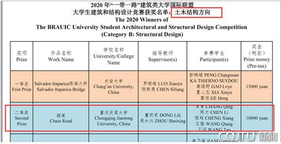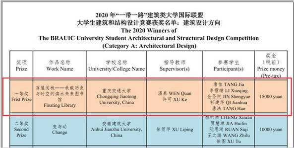 The third part of the Forum was the awarding session of 2020 BRAUIC University Student Architecture and Structural Design Competition. The 4 entries from our students stood out from 250 works from 18 Chinese and foreign universities. Among them, one was awarded first prize in architectural design, another student second prize in the structural design, and two honorable mentions, entitling Chongqing Jiaotong University at the top among all participating universities in the number and quality of prizes. In addition, we also won the "Excellent Organization Prize" and 5 supervisors including Wen Quan, Xu Ke, Dong Lili, Zhou Zhixiang, and Zhou Shuixing won the "Outstanding Supervisor Prize". Prof. Zhang Jie, National Master of Engineering Survey and Design and Dean of the School of Architecture and Urban Planning, BUCEA, commented on the first prize work "Floating Library—A Future Waterfront Library Carrying History, Time and Space" from our university. Professor Zhang Jie regarded the work as an extraordinary one as "the work deeply explored the inexhaustible local context and adapted to the functional space requirements of modern libraries in a novel form". Vice President Yi Zhijian had a group photo taken with the student representatives and supervisors of the first prize winners from the College of Architecture and Urban Planning of Chongqing Jiaotong University and encouraged the winners to continue their efforts and strive to achieve better results.
