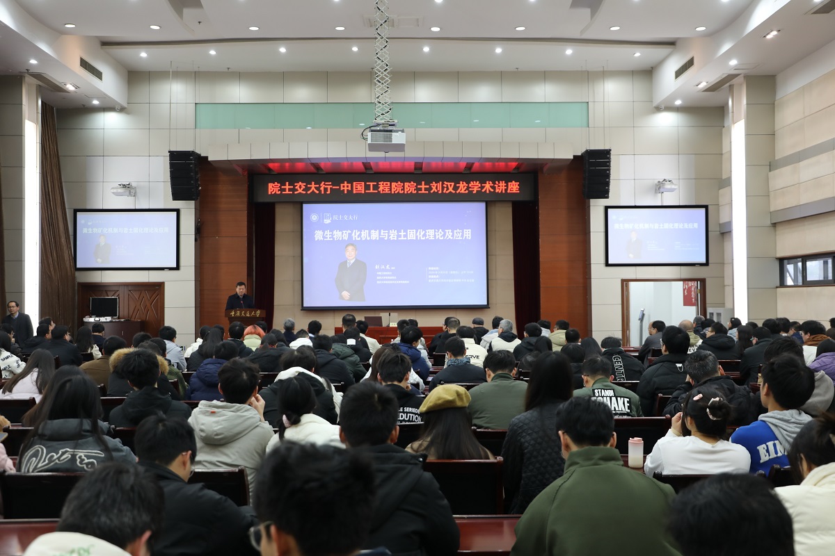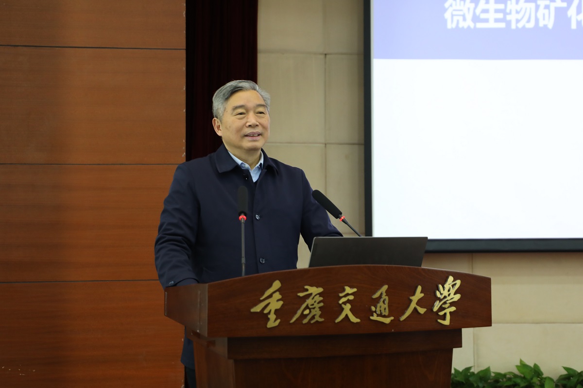 In the morning, the lecture “Academician’s Visit to Chongqing Jiaotong University” was held in 408 Lecture Hall of Mingde Building. Academician Liu Hanlong gave a thematic report on “Microbial Mineralization Mechanism and Geotechnical Solidification Theory and Application” to the students and teachers of the university. Academician Lai Yuanming expressed his warm welcome and thanks to Academician Liu Hanlong for his visit.
