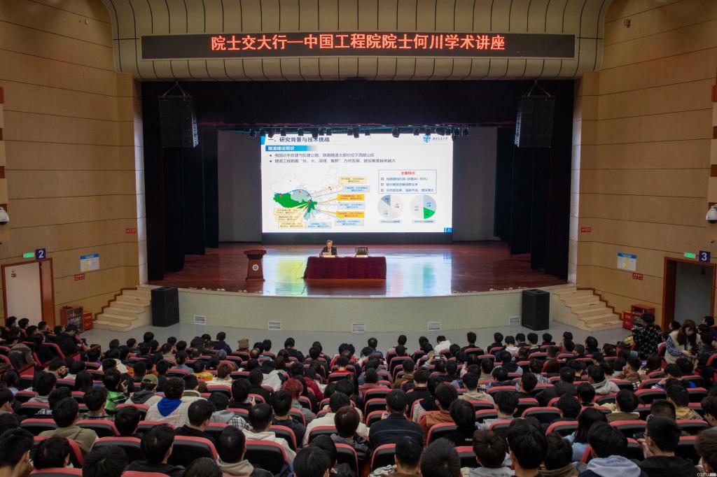 “In the future, we can strive for greater achievements in construction procedures, evaluation systems, system planning, and other aspects to promote the Intelligentization of Tunnel Engineering.” On the afternoon of March 11th, Professor He Chuan, a member of the Party Committee and Vice President of Southwest Jiaotong University, an academician of the Chinese Academy of Engineering, and an alumnus of our university from the class of 1980, was invited to give an lecture at the Science City campus of Chongqing Jiaotong University. Gong Hui, Chairman of the University Board, Vice President Huang Chengfeng, national, Jiang Shuping, China National Exploration Design Master, and Professor Wu Lizhou attended the lecture. Vice President Zhou Jianting presided over the lecture. More than 700 teachers and students listened and gained insights into the Intelligentization of Tunnel Engineering.