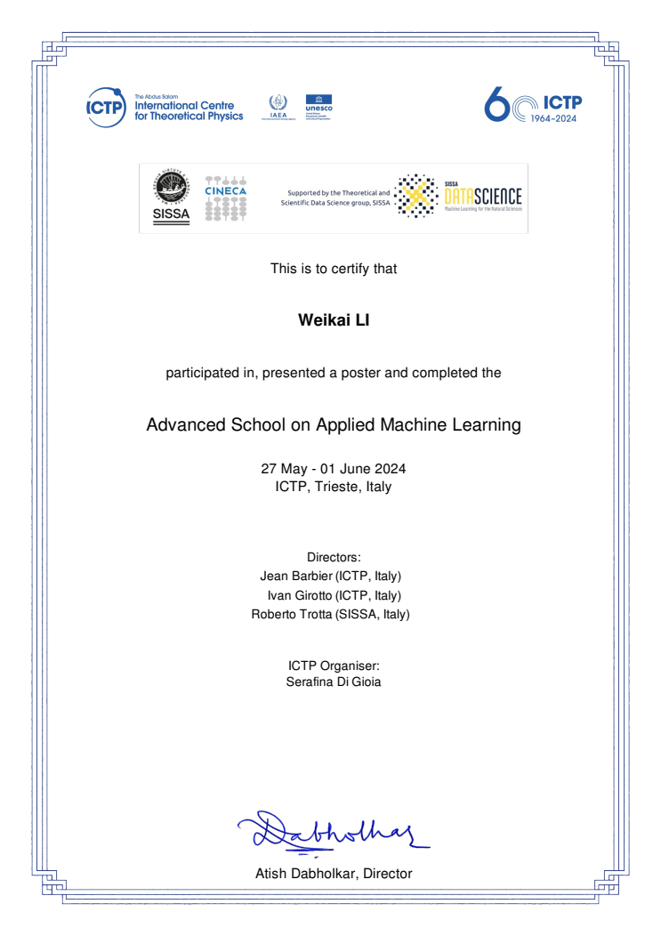 From May 27 to June 1, 2024, the Advanced School on Applied Machine Learning seminar, hosted by the International Centre for Theoretical Physics (UNESCO-ICTP), was held in Trieste, Italy. Dr. Li Weikai, from Mathematics and Statistics School of Chongqing Jiaotong university, was invited to attend the event and showcased the latest research achievements in the field of machine learning from our university.