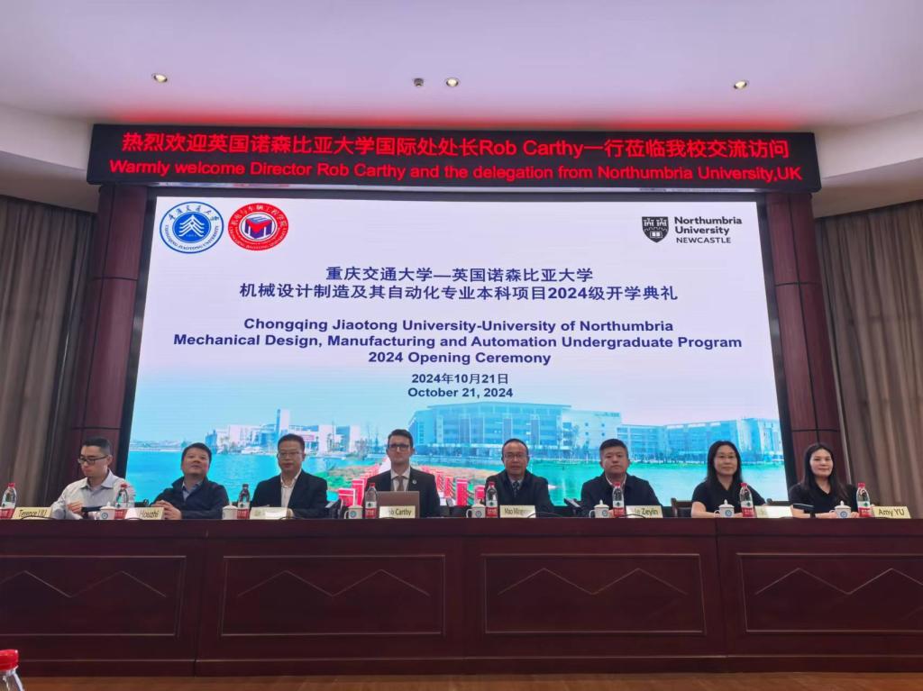 On the afternoon of November 21st, 2024, the opening ceremony of co-operation program in bachelor of mechanical design manufacture and automation between Chongqing Jiaotong University, China and University of Northumbria at Newcastle, United Kingdom was held in the Academic Lecture Hall of Zhiyuan Building, Science City Campus. The Northumbria University’s relevant representatives Rob Carthy, Director of the International Development Office, Sunny Sun, Head of China Region, and the Chongqing Jiaotong University’s relevant representatives Mao Mingyong, Director of the International Office, Xu Houzhi, Deputy Director of the International Office, Lin Xingdong, Deputy Secretary of the Party Committee of the School of Mechanical, Electrical, and Vehicle Engineering, He Zeyin, Vice Dean of the School of Mechanical, Electrical, and Vehicle Engineering and more than 200 teachers and students of the program attended the Opening Ceremony.