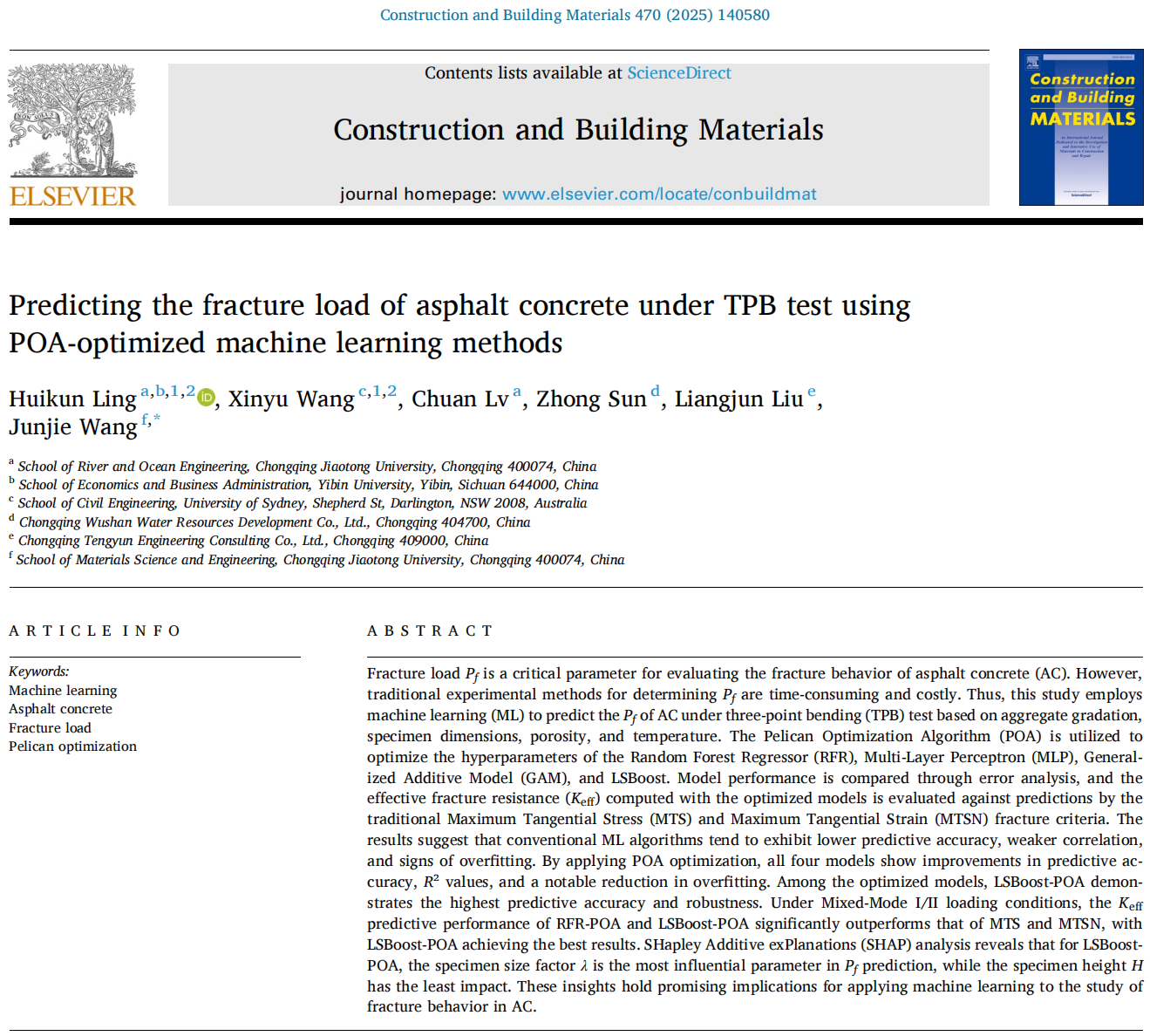 The rapid evolution of deep learning and machine learning technologies is catalyzing a paradigm shift in materials science research, fostering the emergence of intelligent and computationally efficient methodologies. A recent breakthrough in this interdisciplinary domain was achieved by a research team led by Professor Wang Junjie from the School of Materials Science and Engineering. Their paper titled “Predicting the Fracture Load of Asphalt Concrete under TPB Test Using POA-Optimized Machine Learning Methods” was published in the renowned journal Construction and Building Materials. The study successfully integrates machine learning with optimization algorithms, offering an innovative solution for predicting the fracture performance of asphalt concrete, which marks a significant step forward in the field of intelligent material analysis.