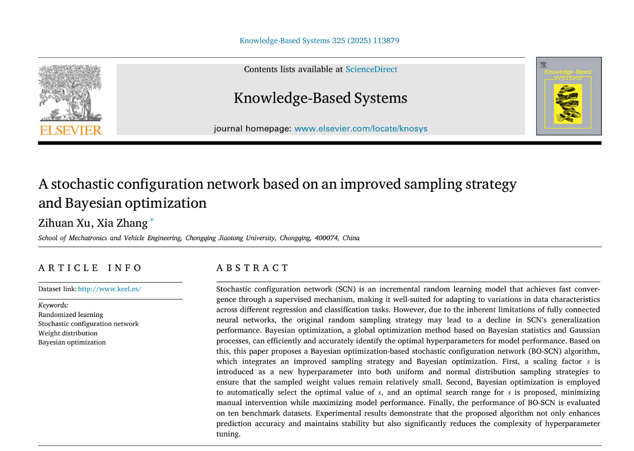 Recently, Xu Zihuan, a master’s student from the Mechatronic and Vehicle Engineering School of Chongqing Jiaotong University (supervisor: Zhang Xia), published a research paper titled “A stochastic configuration network based on an improved sampling strategy and Bayesian optimization” in the Chinese Academy of Sciences (CAS) Zone 1 Top Journal Knowledge-Based Systems. The stochastic configuration network (SCN) algorithm proposed in the paper, which integrates an improved sampling strategy and Bayesian optimization, addresses the core issues of traditional SCN, such as reduced model performance and reliance on manual parameter tuning when handling complex tasks, and breaks through the performance bottleneck of traditional SCN in such tasks.